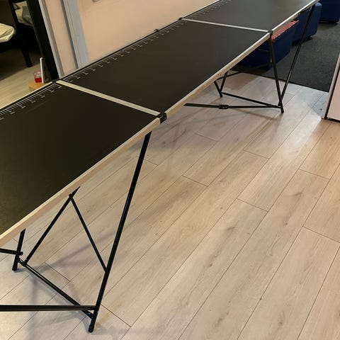 Metallinen 300cm x 60 cm tapetointipöytä, jonka saa kasattua pieneen tilaan.