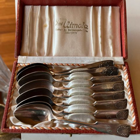 lusikkasetti, sisältää 6 kappaletta lusikoita. Lusikoiden kahvoissa on koristeellinen kuviointi. Käyttökelpoinen sarja esimerkiksi kahvi- tai jälkiruokalusikoiksi. 4kpl leima yr.