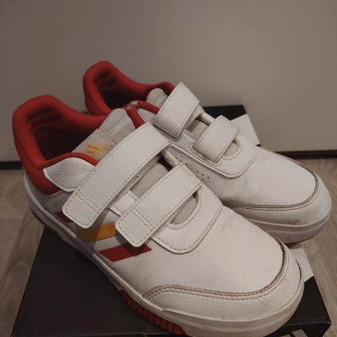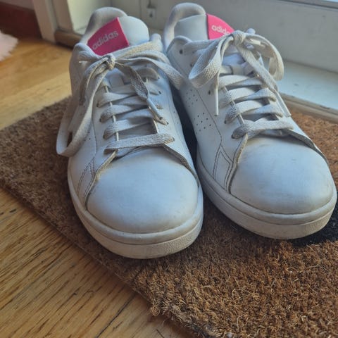 Adidas tennarit, nahkaa koko 36 2/3. Ovh.90-95e. Tunnustelulla huomasin että kummankin kengän takaosassa yksi repeämä sisuskankaassa, kuvat niistä. Ei eläimiä taloudessa.