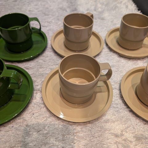 Erittäin hyväkuntoiset aito retro vaaleansininen Sarvis kahvikupit ja lautaset, valmistettu vaaleansinisestä muovista. Setti sisältää kaksi kahvikuppia ja kaksi lautasta. Kupit ja lautaset on merkitty Sarvis Made in Finland,