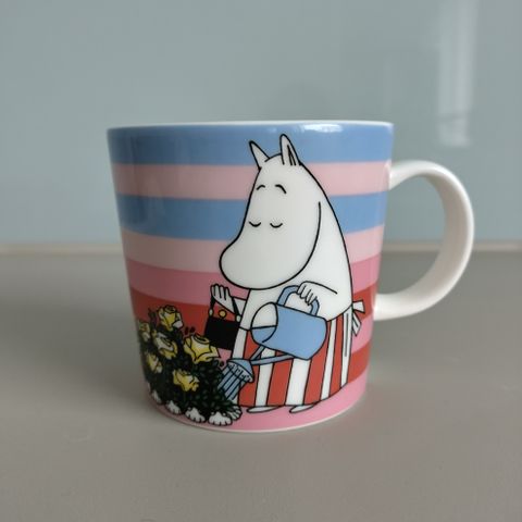 Moomin Seasonal Product 2010 muumimuki, jossa on kukkakuvio ja Muumihahmo. Mukin värit ovat vaaleansininen ja vaaleanpunainen raidallinen tausta sekä valkoinen sisäpuoli ja kahva. Muumimuki on vuodelta 2010 ja on uusi ja tarrallinen. Hyllyssä säilytetty. Nouto tai postitus. Kulkeutuu myös Turkuun omien menojen mukaan.