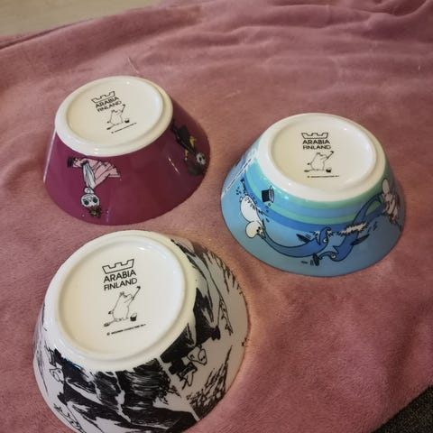 Arabia Muumi mukikulho sarja, musta posliinimateriaali. Muumipappa tuumiskelee. Setissä yksi kulho ja yksi muki. Settejä löytyy useampi. Tietääkseni käyttämättömät. Joissain jopa tarrat kiinni. Kiva lahja kalastavalle tai tuumiskelevalle kaverille.