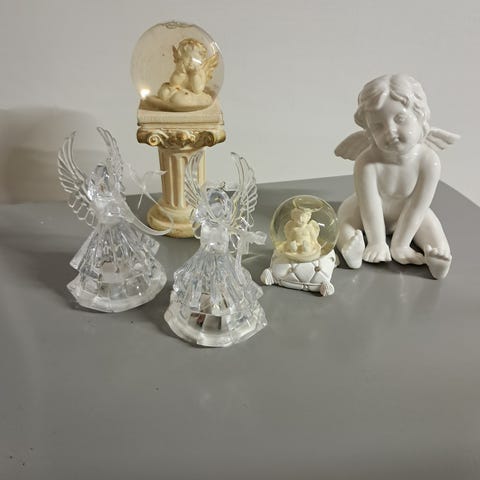 Vanhan ajan vintage enkelikoristeet muovi/pahvikartion päällä. Vasemmanpuoleiset painavat hiekkapainot jaloissa.. Kaikki kerralla 40€ . Yksittäin 6€ kappale. Voin myydä pienemmissä seteissä ja tehdä toridiilipaketin 👍