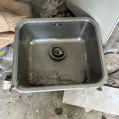 Hyväkuntoinen kolmealtainen rst tiskiallas ja Oras-hana pesukoneliitännällä. Altaan koko 170 x 60 × 30