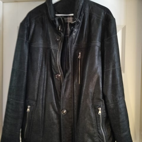 Siisti siniharmaa pusakkamallinen pehmeä mokkanahkatakki. Vetoketjukiinnitys, kaksi povitaskua ja sivutaskut.