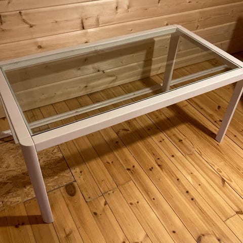 Kuvan mukainen siistikuntoinen sohvapöytä, jossa lasikansi kivisomisteilla.