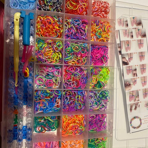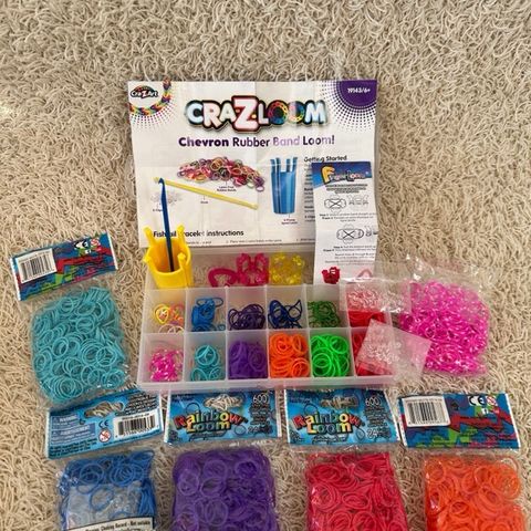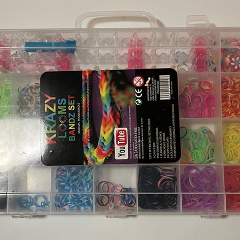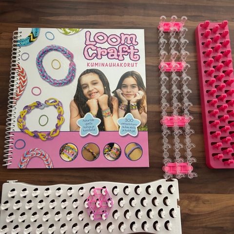 Läjä Loom bands kumilenksuja ja tarvikkeita koteloissa. Mukaan myös kirja, missä malleja, sekä kasa tehtyjä töitä purettavaksi ja uudelleen käytettäväksi. Puuhaa sadepäiviin!