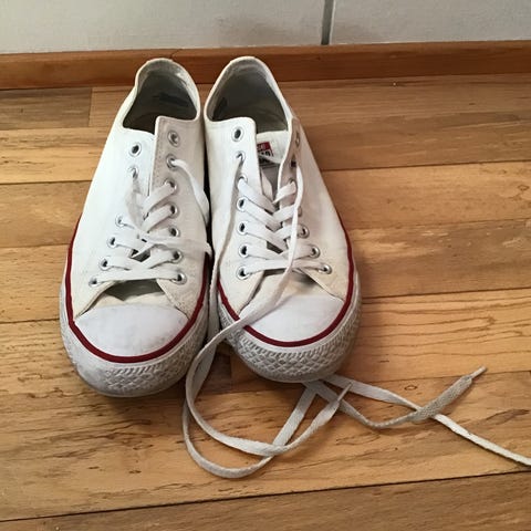Jonkin verran käytetyt conversen tennarit koko 44. Pesemällä saisi varmaan ihan valkoisiksi.