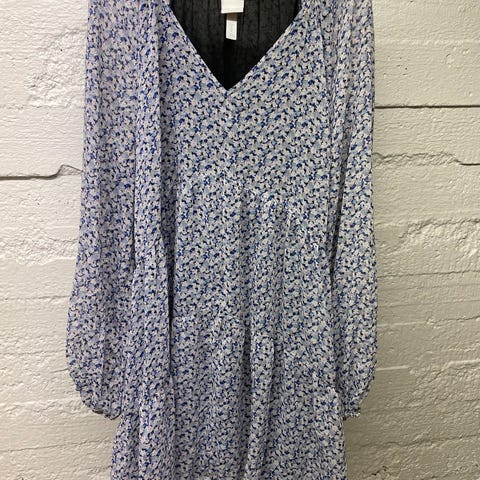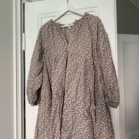 Hippihenkinen kirjava mekko, kevyttä kangasta, pesulapun mukaan 100% puuvillaa. Levenevät hihat, koristellut pitkät vyötärönauhat, pieni halkio helmassa. Kokolapun mukaan s-m, sen kokoisena pidetty.
