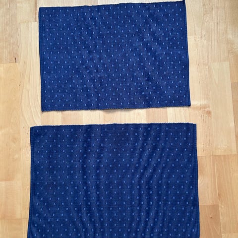 Siniset kankaiset pöytätabletit. Koko 31 x 45 cm. Hyvässä kunnossa.