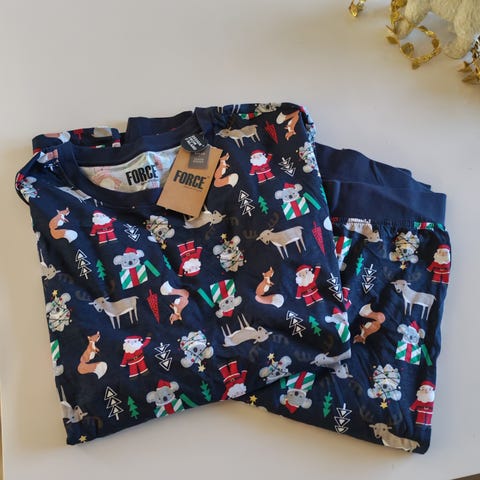 Uusi miesten sininen pyjamapuku alkuperäispakkauksessaan.