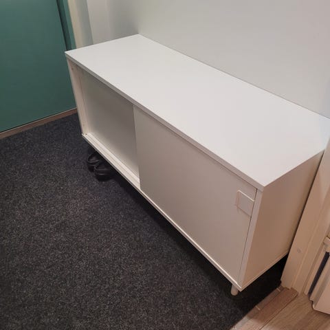 Myydään kenkä-/ eteiskaappi penkillä (Eteiskaluste Mello). Istuinosan leveys 59cm. Kahdessa ylimmässä kaapissa hylly.
