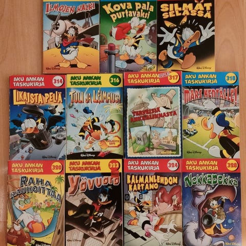 Myydään 18kpl Aku Ankan taskukirjoja. Mukana numerot 339, 341, 344, 351, 352, 354, 360, 369, 373, 380, 384, 385, 387, 389, 390, 395, 398 ja 452.