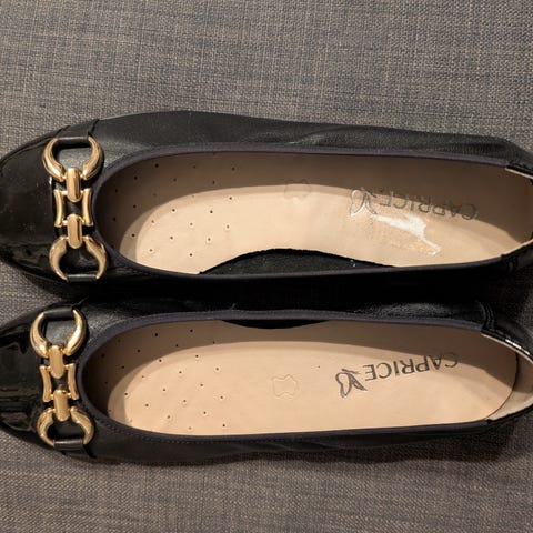 Mustat, kärjessä ”kiiltonahkaa”. Hieman kantaa. Pehmustettu pohja. Koko 7.