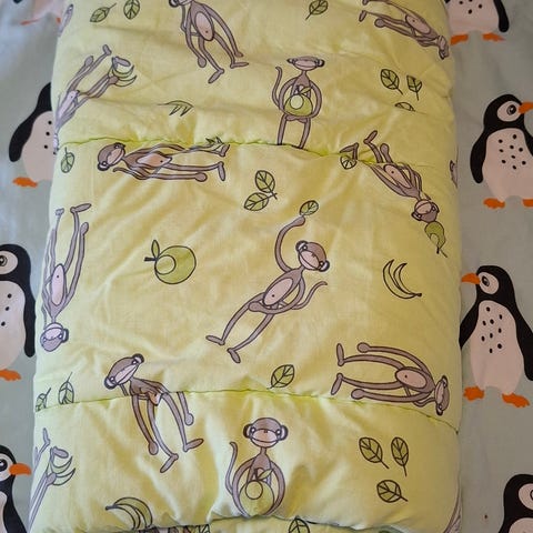 Vauvan makuupussi. Jonkin verran nukkaa, muuten ehjä.