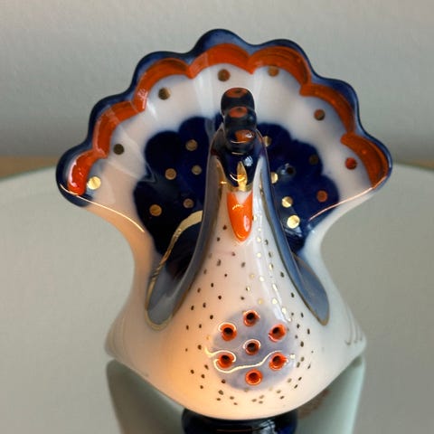 Myydään isoäitini vanha Lomonosov posliinilintu, valmistettu Neuvostoliitossa. Alunperin suolasirotin, mutta pohjan tulppa puuttuu - sopii myös koristeeksi. Maalissa on pieniä kulumia.