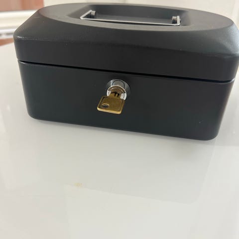 Metallinen rahalipas mustassa värissä, jossa on lukko ja avain. Rahalippaassa on sisällä erilliset lokero-osastot kolikoille ja seteleille. Sopii rahojen ja pienten arvoesineiden säilytykseen.