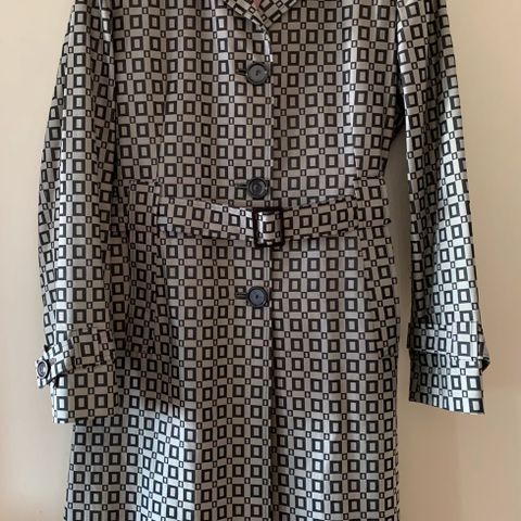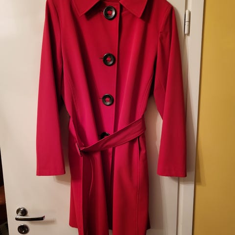 Kuvan pitkä takki, hyvässä kunnossa, Cristina Favioli merkkinen, koko 42, polyesteriä, viskoosia ja elastaania, napit edessä, kauluksessa yksi nappi, taskut edessä. Koirakoti.