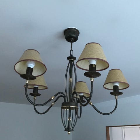 Viisihaarainen valkoinen kattokruunu led-lampuilla.