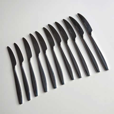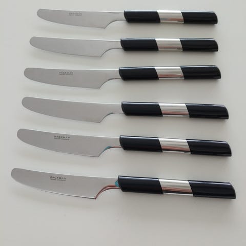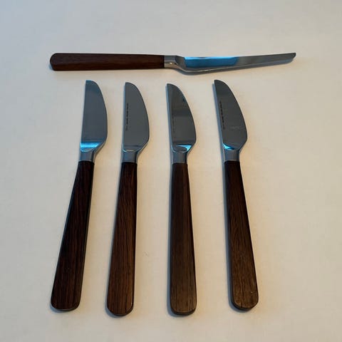 Bertel Gardbergin suunnittelemat Hackmanin Lion de Luxe veitset. Puuosat ovat hyvässä kunnossa, pientä värieroa niissä kuitenkin on. Yhden veitsen kärki on hieman taittunut. Hinta kuudelle veitselle on 50 euroa, yksittäin 12 euroa/ kpl. Kulkeutuu omien menojen mukana Joensuuhun.