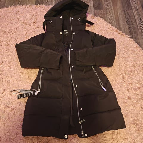 Käyttämätön vaalean sininen/valkoinen naisten talvitakki.
