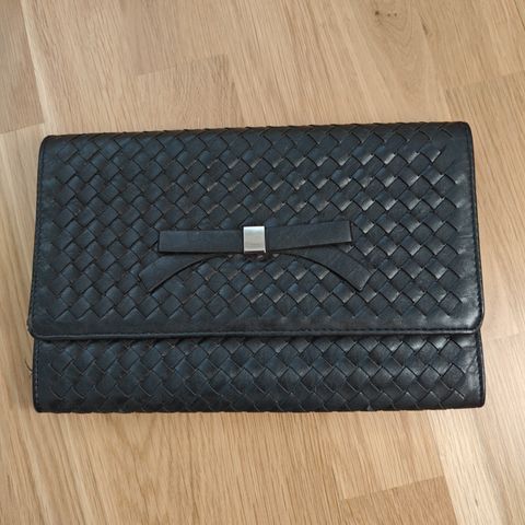 Pieni musta iltalaukku. Mittanauha antamassa kuvaa noin mitoista
