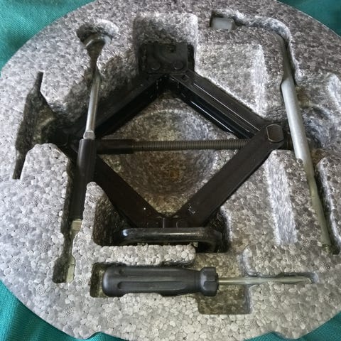 Auto renkaan vaihtotyökalu sarja, sisältää useita työkaluja, kuten ristikkoavain ja muita metallisia vaihtotyökaluja. Työkalut on pakattu vaahtomuoviseen koteloon, joka suojaa ja pitää työkalut järjestyksessä. Sopii auton renkaiden vaihtoon ja perushuoltoon.