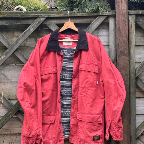 Kuvan takki, todella hyvässä kunnossa, vetoketju edessä ja vetoketjutaskut sivuilla.