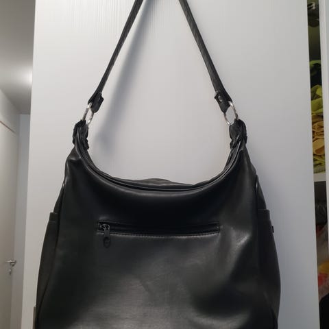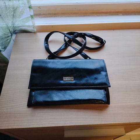 Musta nahkainen Jouni-merkkinen olkalaukku. Mittanauha antamassa kuvaa noin mitoista, olkahihna suurimmillaan.