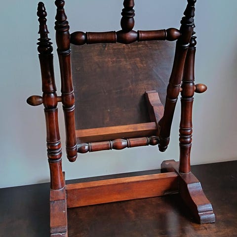 2. Kaunis, vanha oletettavasti yli satavuotias peili. Ei kiinnikkeitä, ollut luultavasti osa piianpeiliä, sivuilla tosin jäljet seinäkiinnityksestä. Yläreunan lista kaipaa liimausta.