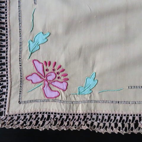 Kaunis Kati Kiiskilän kankaasta ommeltu pöytäliina, kts kuva ompeleesta.