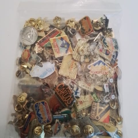 Useita erilaisia pinssikoristeita. Pinssit ovat monenlaisia, sisältäen muun muassa logoja, kuvioita ja tekstejä.