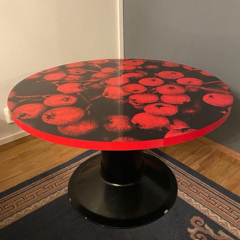 Marimekko pihlajanmarja pöytä ja Yrjö Kukkapuron jalka