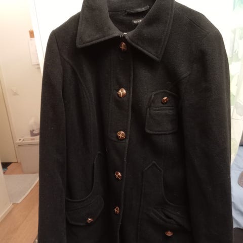 Musta puolipitkä naisten villakangastakki tekonahkahihoilla. Siistissä kunnossa.