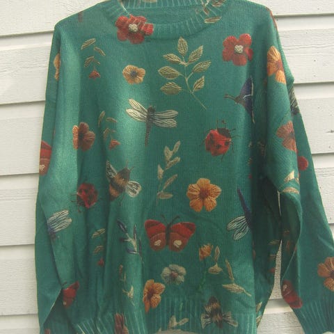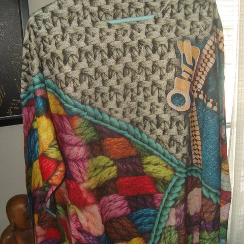 Värikäs erikoinen neule, upeat kuviot edessä ja takana . 100 % polyester. pehmeä mukava ohuehko materiaali. Tämä on neule, mutta kuvio on 3 d printti.