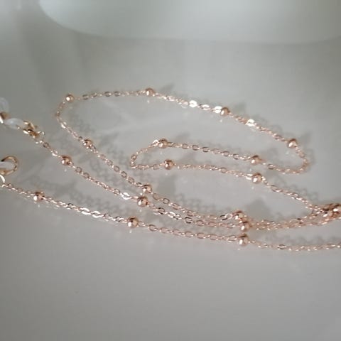 Silmälasien tai aurinkolasien käyttäjälle niskan taakse laitettava koristeellinen kultaketju. Joustavat lenkit kiinnitetään lasien sankoihin ja lasit voidaan välillä ottaa pois. Kimmeltävä, kaunis kullattu tai kullanvärinen materiaali, korumainen, joka sopii myös juhlavampaan pukeutumiseen. Sopii lahjaksi. kullattu ketju kultaketju aurinkolasi tarvikkeet silmälasitarvikkeet silmälasit aurinkolasit joululahja korulahja lahjapaketti