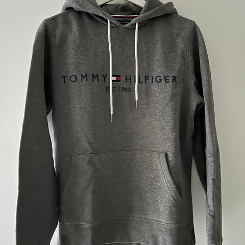 Tommy Hilfiger huppari, koko XS, harmaa väri. Materiaali sisältää orgaanista puuvillaa. Miehille suunniteltu malli, jossa on hupullinen kaulus ja etutasku. Edessä Tommy Hilfiger -logo ja valmistusvuosi 1985. Hupparin hihassa pieni kulumajäljki muuten huppari kuin uusi.