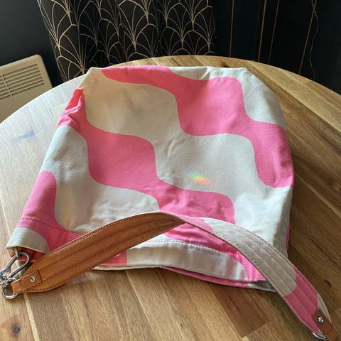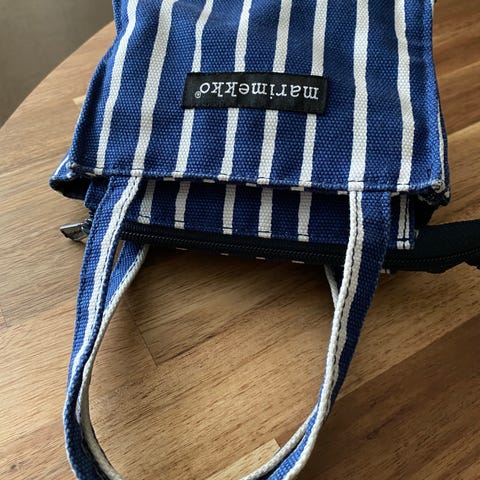 Marimekkon Vellamo käsilaukku. Metalli hihna, pituus 60cm, saa myös piiloon laukun sisälle. Leveys 30cm, syvyys 4cm ja korkeus 15cm.
