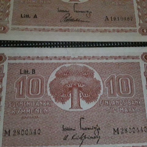 2 kpl erittäin hyväkuntoisia 5 markan sileitä seteleitä v.1945,Litt A