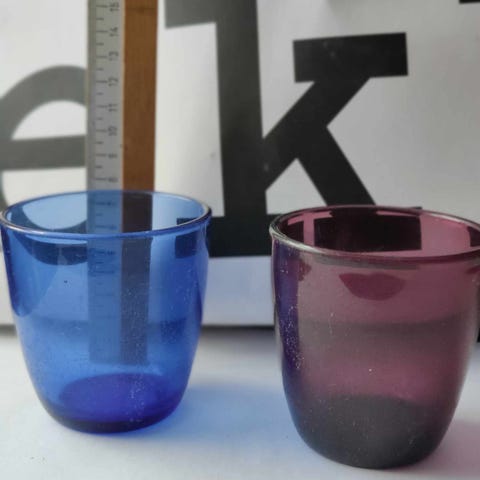 Hyväkuntoinen vanha lasi. Korkeus 8 cm, halkaisija 7,5 cm. Paksua lasia. Syvä tummanvihreä.