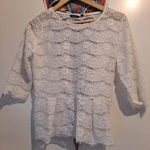 Naisten pitsipaita, koko S (36), beige värinen. Paita on valmistettu 100% viskoosi ja siinä on pitkä hiha sekä kaulus.