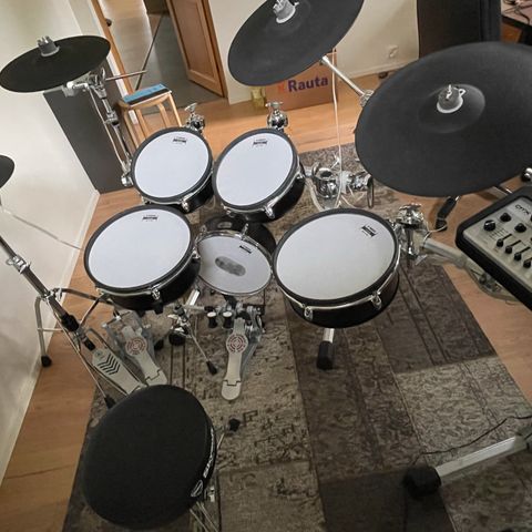 Myydään kuvanmukainen sähkörumpusetti, ostettu vuonna 2020. Täydennetty, mukaan jakkara. Huom. kuluma yhdessä padissa, muuten erinomaisessa kunnossa. Tule kokeilemaan Myllypuroon!