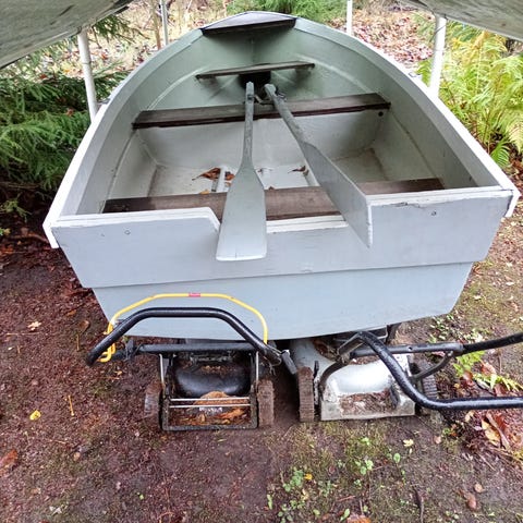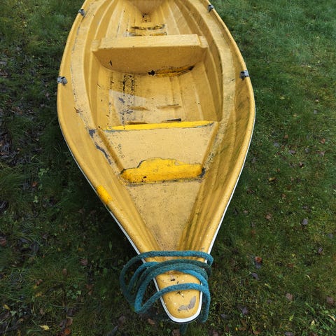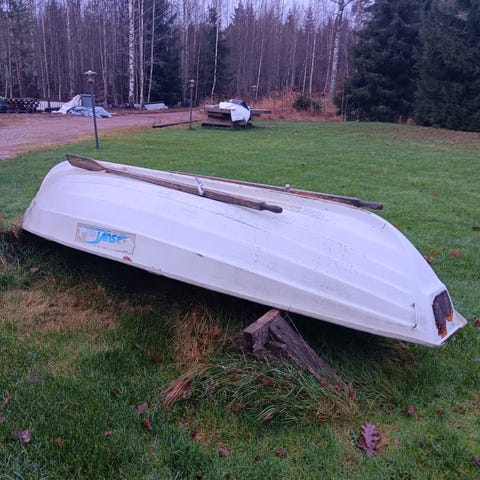 Pituus noin 4 metriä. Kevyt ja helpposoutuinen. Airot mukaan. Pohja maalattu topcoatilla. Ei kedon kaunein kukkanen, mutta toimiva kalastus- tai vaikka sorsastusvene. Myynnissä myös pieni perämoottori ja könttänä voidaan hintaa pyöristää. Pyynnöstä lähetän lisäkuvia.