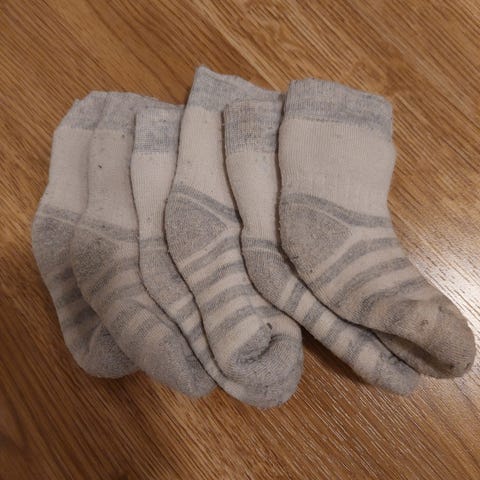 Merinovillasekoite sukat, varressa koko 25-27, mutta mielestäni vastaa enemmän 23-25 kokoa (tai sitten ovat pesussa pienentyneet). Ehjät ja siistit, mutta pinnassa nukkaa. Postitse tulee kirjeenä, postimaksu hinnassa mukana.