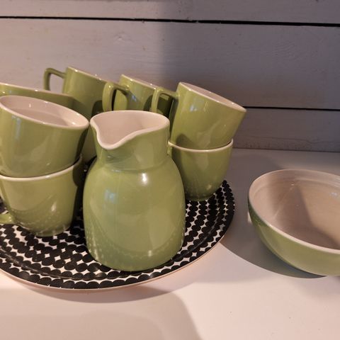 Siistit kermansavi oliivi-kupit ja tassit. Kuppeja neljä, lautasia useampi.