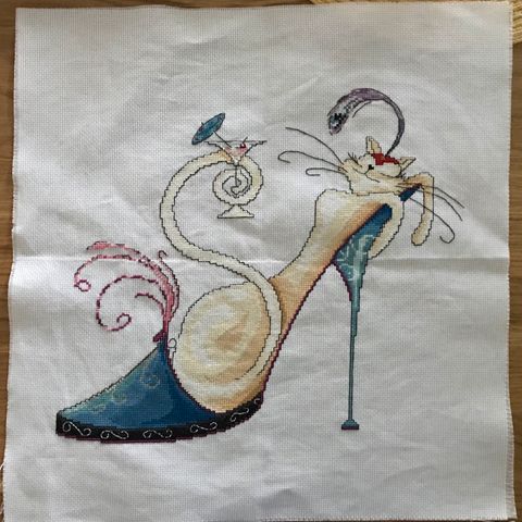 Ristipistotyö Kissa torkuilla korkokengässä valmis kirjontatyö