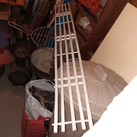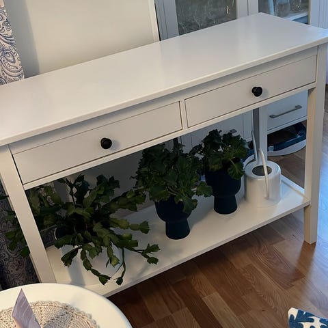 Valkeaksi maalattu rottinkinen kukkapöytä.