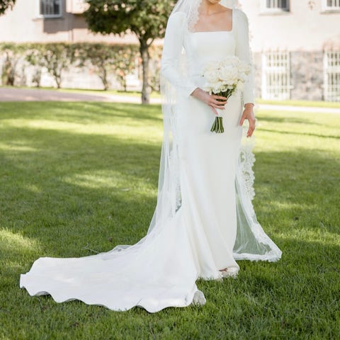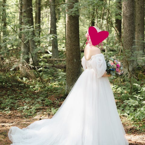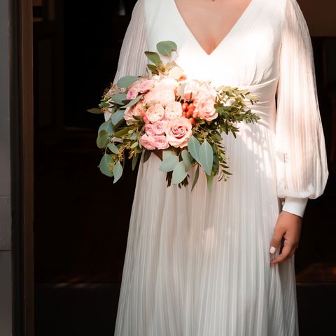 Mekko Tallinnan OhMyBride -liikkeestä. Malli REM, joka teetetty mittojen mukaan. Käytän yleensä vaatekokoa M-L, ja mekko teetetty mitoille jossa rinnanympärys n. 99cm ja vyötärö 82cm. Olen 163cm pitkä ja jalassa mekon kanssa 8cm korot. Mekon sisällä nyörit ja mekko sulkeutuu ulkopuolelta hakasilla. Pitkä laahus, jonka saa lenkillä nostettua liikkuessa. Pesulassa pesetetty, säilytyksessä pukupussissa. Mekon ovh. 1090€.