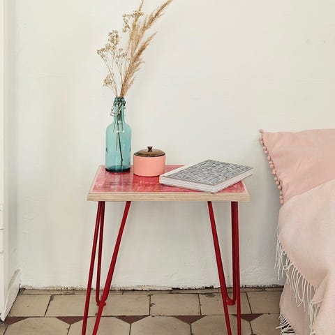 Tämä uniikki pieni pöytä sopii myös jakkaraksi. Se on tehty suomalaisesta koivuvanerista ja siinä on käsin maalattu kuviointi, sekä metalliset tukevat mutta sirot pinnijalat.