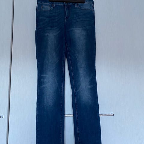 Puuvillaa, polyesteria ja elastaania, suora lahje, hyvä vyötärö, taskut ja vyön lenkit koko W31 ja L30 ( hinta postikuluineen)